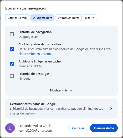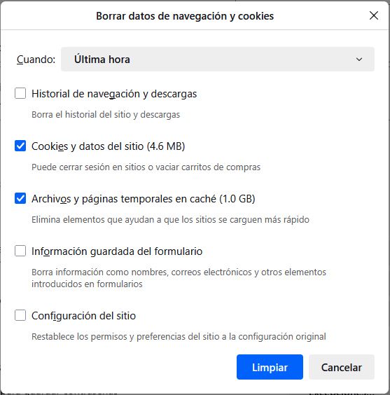 - Marca Cookies y datos del sitio y Archivos y páginas temporales en caché